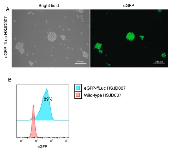 Patient-derived DIPG neurospheres were examined for GFP expression 96 h after lentiviral transduction. (A) Fluorescence microscopy of patient-derived DIPG neurospheres 96 h after infection after lentiviral transduction showing bright field (left) and fluorescence (right) images. (B) Flow cytometry analysis of patient-derived DIPG neurospheres (HSJD007) after lentiviral transduction. Proportions of HSJD007 expressing eGFP (blue) were detected using flow cytometry 96 h following lentiviral vector transduction compared to wild type counterparts (red).