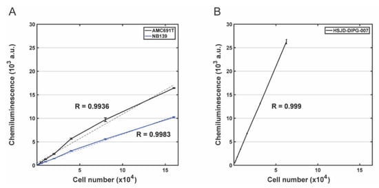 Correlation of tumour cell number and chemoluminescence signal using the luciferase assay for in vitro cell proliferation measurement. (A) Measurement of luminescence in two transduced eGFPffLuc neuroblastoma organoids (NB139 and AMC691T). (B) Measurement of luminescence in two transduced eGFP-ffLuc DIPG neurospheres (HSJD007). Different cell densities were seeded onto 96-well plates and the luminescence was measured after 10 min in their presence. Results are represented by average of triplicate values. R shows the linear correlation of luminescence and cell number in neuroblastoma and DIPG cells.