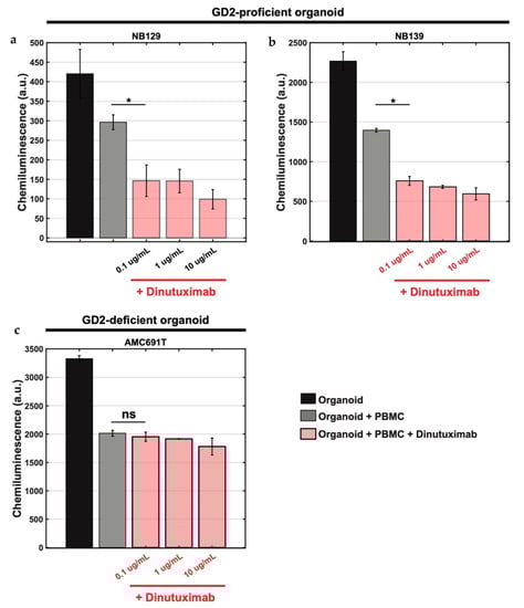 Effect of Dinutuximab treatment on neuroblastoma cells cocultured with PBMCs. Chemiluminescence-based cell viability was measured using the ADCC luciferase assay. (a,b) The viability of neuroblastoma cells (black column) were compared with cocultured neuroblastoma cells with PBMCs (grey column, used as negative control) in the presence of dinutuximab, an FDA-approved monoclonal antibody targeting GD2 antigen. Tumour cells were exposed for 4 h to 0.1, 1 and 10 ug/mL of dinutuximab in GD2-proficient organoid lines NB129 and NB139. (c) Similar to a and b, the neuroblastoma organoids (cocultured with PBMCs) were exposed for 4 h to 0.1, 1 and 10 ug/mL of dinutuximab in GD2-deficient organoid lines AMC691T cells. All experiments were performed in triplicate. Error bars represent standard deviation values. * p value is less than 0.01.