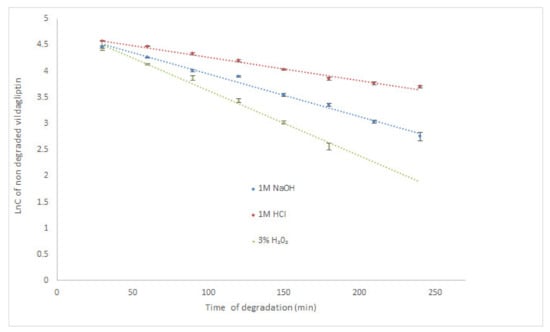 The concentrations of no degraded vildagliptin remaining after each time of degradation or logarithms of these concentrations were plotted against time of degradation, in order to obtain the equations y = ax + b and the determination coefficients R2, and in consequence to determine the reaction order. The slopes of the obtained linear equations were used for calculate further kinetic parameters, i.e., degradation rate constant (k) and degradation time of 50% (t0.5).
