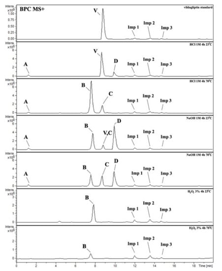 BPC MS+ chromatograms of the analyzed samples. V=vildagliptin, A, B, C, D = Compounds A–D (degradation products of vildagliptin) and Imps 1–3.