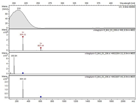 There are some other minor peaks at our BPC chromatograms of the analyzed samples, namely Imps 1–3 (Table 5), probably from impurities present in our vildagliptin standard. Their MS and UV/VIS spectra are shown in Supplementary Materials in Figures S1–S3.
