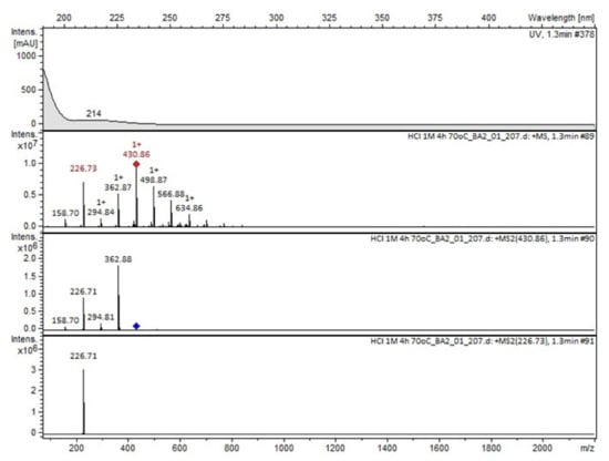 UHPLC-DAD-MS/MS was performed using a Dionex Ultimate 3000RS device (Dionex, Sunnyvale, CA, USA). The chromatograph was coupled with a Bruker Amazon SL ion trap mass spectrometer (Bruker Daltonik, Bermen, Germany) without splitting. The separation was carried out using a Kinetex XB-C18 column (150 × 2.1 mm, 1.7 µm) from Phenomenex (Torrance, CA, USA). The column was eluted with A: 0.1% formic acid in deionized water and B: 0.1% formic acid in acetonitrile. The two-step gradient was used from 0% B to 30% B in 13 min and 30% B to 65% B up to 20 min. The column temperature was maintained at 25 °C with the flow rate set to 0.3 mL/min. The UV/VIS signal was recorded from 190 to 450 nm. The eluate was introduced directly to the mass spectrometer. The mass spectrometer was equipped with an ESI interface working in a positive ion mode with settings as follows: capillary voltage 4500 V, endplate offset 500 V, nebulizer pressure 40 psi, drying gas temperature 145 °C and gas flow rate 9 L/min. The instrument was used with the smart parameter setting (SPS) fixed at 450 amu. The scan range was from m/z 70 to m/z 2200. The MS/MS was switched on and two the most abundant ions were subjected to fragmentation.