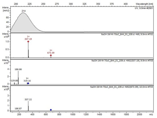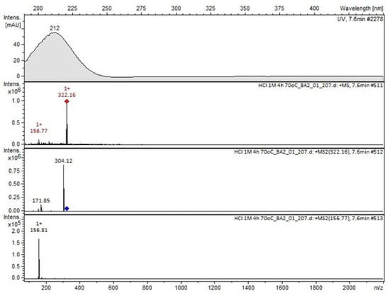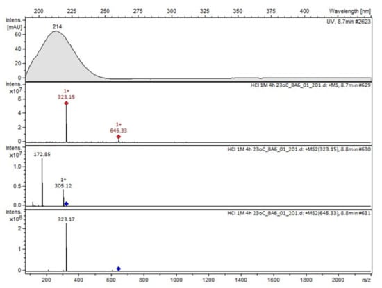 It was interesting to observe that other degradants of vildagliptin that had been reported previously [,], were not observed in the present study. In addition, it seemed reasonable to discuss more deeply the structures of our Compound C and the degradant DP 4 from the literature []. DP 4 with pseudomolecular ion at m/z 323.6 was detected in the samples of vildagliptin stressed in basic conditions. Bearing in mind its retention time (tR) in respective LC chromatograms, it was relatively more polar than IMP B. In the present study, Compound C with m/z 323 was detected in the samples of vildagliptin stressed in basic, as well as, acidic conditions. On the contrary to DP 4, Compound C was shown to be relatively less polar than Compound B (IMP B), because of its longer tR during our LC-MS experiments. Thus, the chemical structure of Compound C, different than that that described for DP 4 was proposed. Respective UHPLC data of the detected Compounds A–D are given in Table 5. Chromatograms (ion current, BPC MS+) of the analyzed samples and vildagliptin pure standard are presented in Figure 4. MS and UV/VIS spectra of the detected Compounds A–D are shown in Figure 5, Figure 6, Figure 7, Figure 8 and Figure 9.