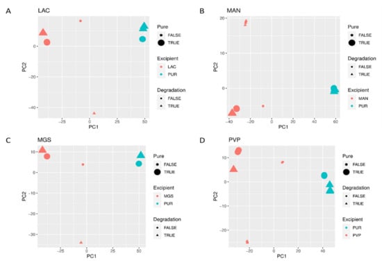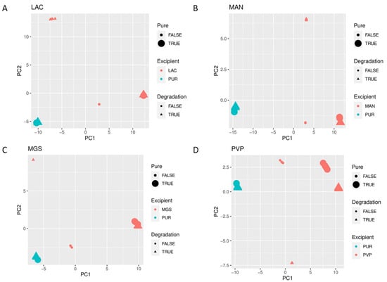 (A–D) PCA scores plots of mid-IR spectra of vildagliptin (Pure Drug) and the mixtures of vildagliptin with Excipients: (A) lactose (LAC), (B) mannitol (MAN), (C) magnesium stearate (MGS) and (D) polyvinylpirrolidone (PVP).