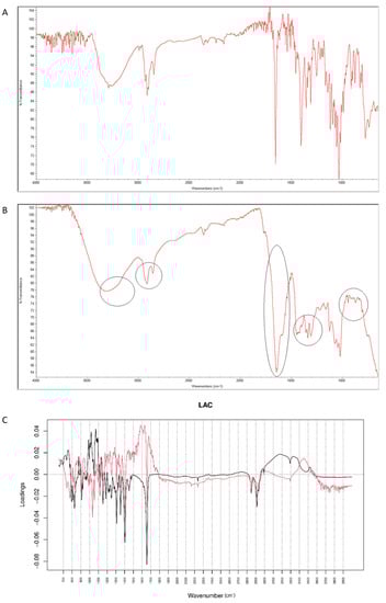 (A–C) Vildagliptin and lactose (LAC): mid-IR spectra of no stressed mixture (A), stressed mixture (B) and PCA loadings of the spectra (C); PC1 loadings are marked black while PC2 loadings are marked red; most visible differences in the spectrum of the stressed mixture are indicated with circles.