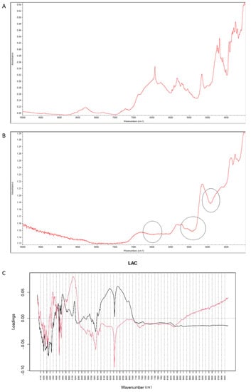 When NIR spectra were analyzed by PCA, PC1 explained 99.30% of variability while PC2 0.494%. PC1 variability was mainly connected with obvious spectral differences between vildagliptin and LAC but some interactions with this excipient could also be confirmed in respective spectra (Figure 13A,B). According to PC1 values, the main source of variability was connected with an increase of absorbance in the region 6000–7000 cm−1 (the first overtones of C-H, N-H and O-H) with a characteristic decrease at 6400 cm−1. In addition, an increase of absorbance in the region 4700–5200 cm−1 (the first and second overtones of C=O and the C-H and O-H combinations) was observed. When PC2 loadings were considered, the main source of variability was connected with the wavenumbers 5300 cm−1, 4700 cm−1 (the N-H and O-H combinations) and 6500 cm−1 which could reflect changes due to interactions of vildagliptin with LAC (Figure 13C).