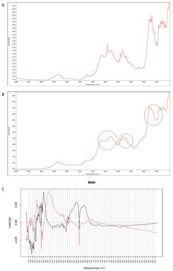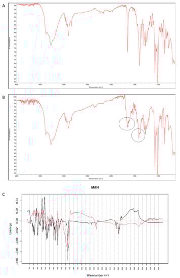 After mixing vildagliptin with MAN, the signal of N-H and O-H vibrations of vildagliptin at 3294 cm−1 were overlapped with respective peaks of MAN (3200–3300 cm−1). In addition, a band of MAN at 1090 cm−1 deteriorated to 1076 cm−1, probably due to hydrogen bond formation between its -OH groups and -NH- group of vildagliptin (Figure 14A). After stressing with high temperature and humidity, the peak corresponding to a sharp band of CO from vildagliptin at 1658 cm−1 changed its shape (Figure 14B). For the mid-IR spectra, PC1 and PC2 explained 63.30 and 21.50% of variability. The loading spectrum of PC1 was dominated by a broad band at 3000–3500 cm−1 showing spectral differences that occurred in the mixture of vildagliptin and MAN in these regions of the spectra. On the other hand, the bands at 1450–1350 cm−1 where PC1 was positive and PC2 was negative, and the broad band at 1650–2000 cm−1 in PC2 loading spectrum indicated some changes due to accelerated degradation of vildagliptin in the presence of MAN (Figure 14C).