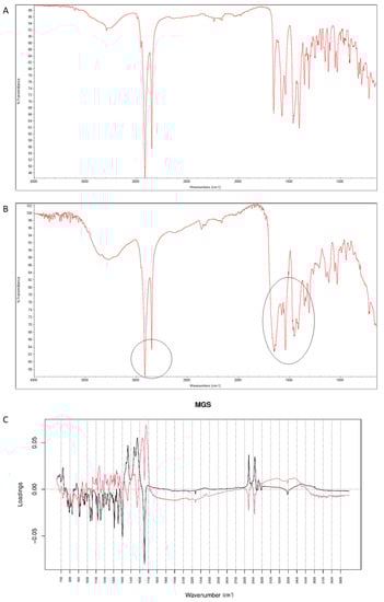 (A–C) Vildagliptin and magnesium stearate (MGS): mid-IR spectra of no stressed mixture (A), stressed mixture (B) and PCA loadings of the spectra (C); PC1 loadings are marked black while PC2 loadings are marked red, most visible differences in the spectrum of the stressed mixture are indicated with circles.