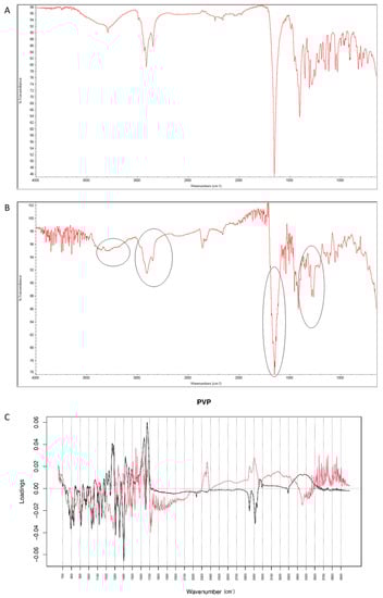 (A–C) Vildagliptin and polyvinylpirrolidone (PVP): mid-IR spectra of no stressed mixture (A), stressed mixture (B) and PCA loadings of the spectra (C); PC1 loadings are marked black while PC2 loadings are marked red; most visible differences in the spectrum of the stressed mixture are indicated with circles.