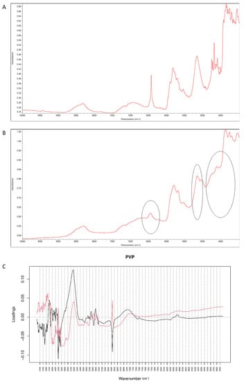 When the degraded mixture was analyzed by NIR method, visible changes occurred at 6400–6500 cm−1 and 5000–5100 cm−1 (Figure 19A,B). Inspecting PCs values for vildagliptin and P it was concluded that PC1 explained 99.60% of variability while PC2 0.320%. PC1 and PC2 loadings plots were dominated by the bands at 4600–4700 cm−1, 4100–4400 cm−1 and 1600–1700 cm−1 where PC1 scored negatively while PC2 scored positively, and at 4700–5300 cm−1 where both PCs scored positively. The most of variability showed spectral differences between vildagliptin and PVP themselves. However, characteristic bands in PC loadings confirmed the changes due to chemical interactions, concerning vildagliptin (6500 cm−1) and PVP (5150 cm−1).