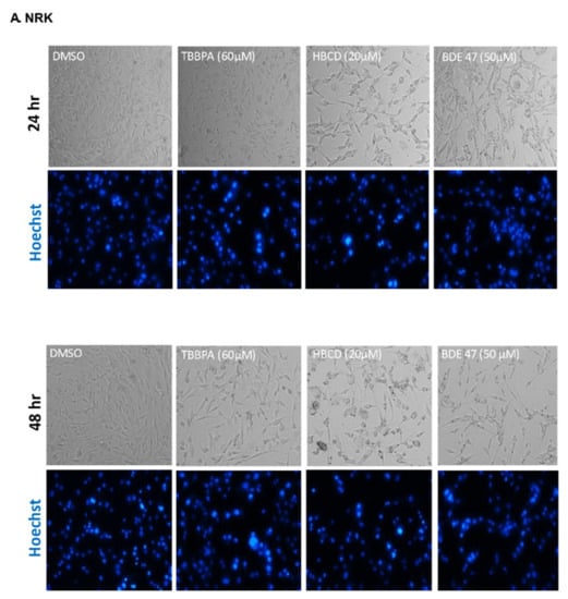 NRK, HK-2, and RPTEC cells were seeded in 12-well tissue culture plates at 150,000 cells per well. Cells were treated for 24 h and 48 h with each BFR at the IC50 calculated from the MTT assay or with an equivalent volume of DMSO. Cell morphology was assessed using a Nikon Eclipse Ti-U inverted microscope (Melville, NY, USA). Cells were then fixed in 4% paraformaldehyde and stained with 1 µg/mL Hoechst 3,3342 for 15 min in the dark at room temperature. Pictures were taken using the same microscope with a DAPI fluorescence filter.