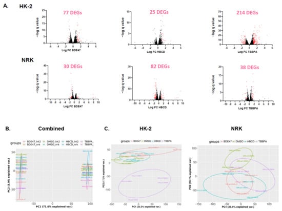 Differential gene expression analysis of RNASeq data in BFR-treated rat (NRK) and human (HK-2) cells. Cells were exposed for 24 h to each BFR at the 48-h IC50s shown in Figure 1. This was repeated across n = 5 passages for each cell line. (A) Volcano plots depict the number of differentially expressed genes for each treatment group. Significantly up-and down-regulated genes are shown in pink and were selected based on the following criteria: (1) the fold change was >2 and (2) the false discovery rate (FDR) was < 0.05. (B,C) Principal components analysis (PCA) of the significantly differently expressed genes (DEGs) from (B) all treatment groups combined and (C) within each cell line. Each color represents a specific cell line that was treated with a specific BFR according to the color legend above each PCA plot. (D) Venn diagrams showing the overlap in DEGs between rat and human cells for each BFR. (E) Venn diagrams showing the overlap in DEGs between BFRs for rat and human cells, respectively.