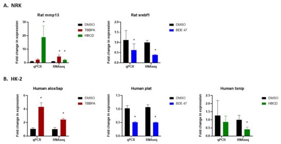 Validation of RNAseq data using qRT-PCR for select differentially expressed genes in the original samples from RNA sequencing. (A) Comparison between delta-delta ct values from qRT-PCR and fold-change in CPM values from RNASeq in NRK cells for mmp 13 in TBBPA and HBCD-treated cells and for srebf1 in BDE-47-treated cells. (B) Comparison between delta-delta ct values from qRT-PCR and fold-change in CPM values from RNAseq in HK-2 cells for alox5ap in TBBPA-treated cells, for plat in BDE-47-treated cells, and for txnip in HBCD-treated cells. GAPDH was used as a housekeeping gene for all qRT-PCR experiments. Each bar represents the mean ± SD across n = 3–5 passages of cells. * Indicates significant difference (p < 0.05) compared to DMSO control.