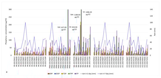 The 2017 sampling season was associated with multiple rain events (Figure 3a). Important rainfall events with 7-day accumulation of more than 40 mm were observed every month with the exception of May and September. In PR, the abundant N fractions observed in early spring included DON, TDN and TKN while NOx levels were low (0 to 0.5 mg N/L). The highest concentrations of DON and TKN in the river were 1.86 and 2.07 mg N/L, respectively, at the beginning of June (Tables S1 and S2). Their concentrations were very similar, which indicates that the dominant forms of N were organic. High concentrations of NOx (3.87 mg N/L) were measured on June 22 in both PR and PRM following significant precipitation that contributed to a 7-day rain accumulation of 100 mm (Tables S1 and S5). In the 2017 samples, the dominant fractions of bioavailable N identified in PR and PRM throughout the sampling season were NOx and TDN, whereas TKN was the principal form of N in St1, St2 and SBL samples (Figure 3a). The highest concentrations of various forms of nitrogen that year were measured in the SBL station at the end of August during a bloom event. On that day, DON, TKN and TN concentrations were 4.68 and 21.70 and 21.68 mg/l, respectively (Tables S1 and S2). These concentrations showed that TKN was the major nitrogen fraction and consisted of particulate organic nitrogen.