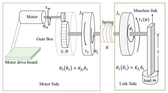 The system comprises two parts, as shown in Figure 1. The left part is the motor side, which includes a motor drive board, a DC motor, and a gear reduction box. The right part is the link side, which is composed of a massless link and a load. The two sections are linked by an elastic element, which is modeled as a linear spring. The FJ robot rotates in a vertical plane with the assumption that the elastic element can only deform in the direction of joint rotation []. The driving torque provided by the DC motor is , and the gear reduction ratio is . The motor side torque is . The stiffness of the linear spring is K. The angular position of the motor side is , and the link side angular position is . When the joint rotates, the joint can deform in the direction of rotation, and the torque can be represented by , where denotes the deformation of a linear spring. and stand for the angular velocity of the link side and the motor side, respectively. Similarly, and symbolize the angular acceleration of the link side and the motor side, respectively. For the sake of simplicity, we presume the viscous damping on the motor side and the link side to be and , where and denote the damping coefficient of the motor side and the link side, respectively. represents gravity, where m is the quality of the load, g is the gravity acceleration, and l is the length of the massless link. The rotary inertia of the link side and the motor side are and , respectively. Then, based on the Euler–Lagrangian equations, the system dynamics is formulated as (1) []