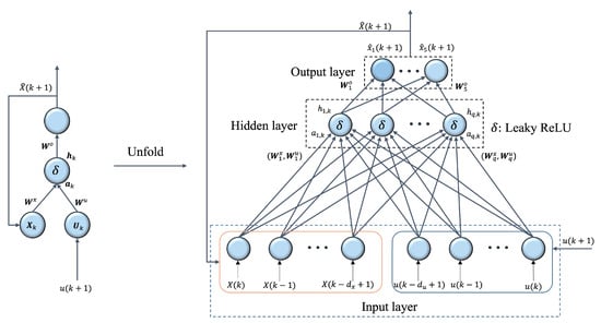 where symbolizes the weight vector of jth output neuron concerning hidden layer neurons, and is the bias of jth output neuron. , where q is the number of hidden neurons. Combining (13)–(16), ReLU-RNN is capable of estimating system dynamic model by (17)