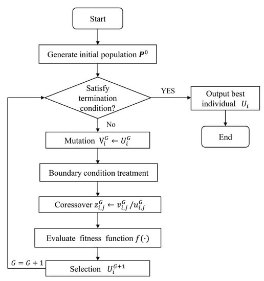 where signifies the initial mutation factor. The adaptive mutation factor is , which is a big value at the beginning of the evolution. Then, the diversity of individuals can be maintained, and it benefits for avoiding premature. In the later evolution period, the mutation rate is close to , the better individual is retained, and the damage of the optimal solution is avoided. In this approach, the probability of searching for the global optimal solution is enhanced. The flow chart of the DEO algorithm is shown in Figure 3.