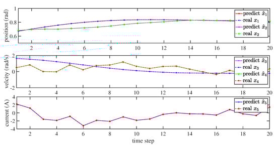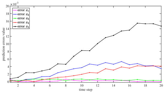 Figure 5 displays the progress of the multi-step prediction of the ReLU-RNN predictive model. Correspondingly, Figure 6 shows the absolute errors. The figures show that, even if a forward prediction was 20 time steps, the performance of the ReLU-RNN predictive model was also satisfied, and it could be used to establish an NMPC controller.