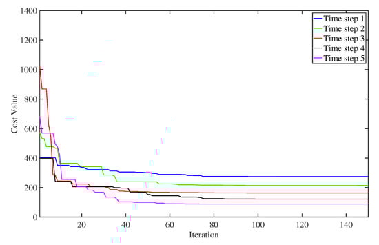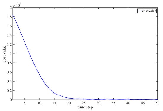 The experimental results proposed by [,] have shown that the DEO has good convergence properties. To demonstrate the convergence of DEO, the cost values of the optimization process are plotted in Figure 7 and Figure 8. Figure 7 displays the cost values in evolutionary iteration at each time step. It can be seen that the cost value converged to a fixed value after 80 iterations. Figure 8 shows the optimized cost values at the target tracking process. We can see that the cost values converged to a small value with the increase of time step, which indicates that the DEO could solve the proposed controller effectively.