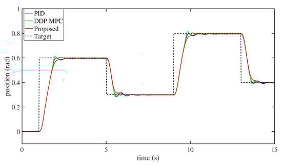 Figure 9 indicates that there were some overshoots and residual vibration in the system response when controlled by the PD and DDP MPC methods. This is due to the existence of an elastic element in the FJ robot, which led to the overshoots and residual vibration being easily inspired. Nevertheless, from Figure 9, we can see that the proposed controller was able to reduce the overshoots and suppress the residual vibration.
