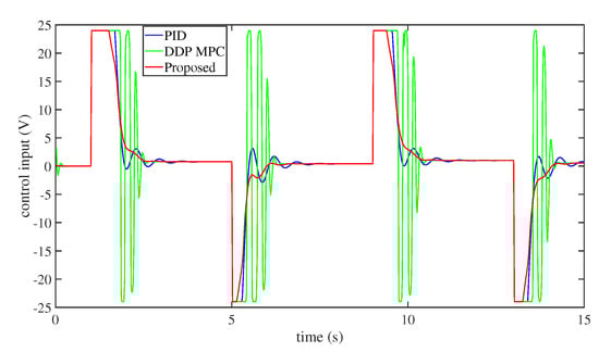 - Finally, to demonstrate the efficiency and performance of this technique, some numerical simulation comparisons between our method and the PD method and the differential dynamic programming (DDP) [] MPC approach have been established. Numerical simulation findings illustrate that the performance of this technique is superior to that of the PD and DDP MPC methods.