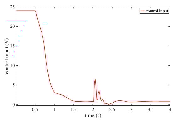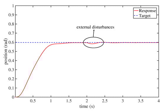 The need for a closed-loop system is important in the presence of external disturbances. To verify that the proposed controller is robust to external disturbances, we added external disturbances to the system. Figure 11 and Figure 12 show the system responses with external disturbances. As can be seen from Figure 11, the system responded quickly and remained stable. The control performance was also fairly satisfactory. Figure 12 depicts the control actions, which demonstrates that the proposed controller could be solved by the DEO efficiently and it could achieve a good robustness against external disturbances.