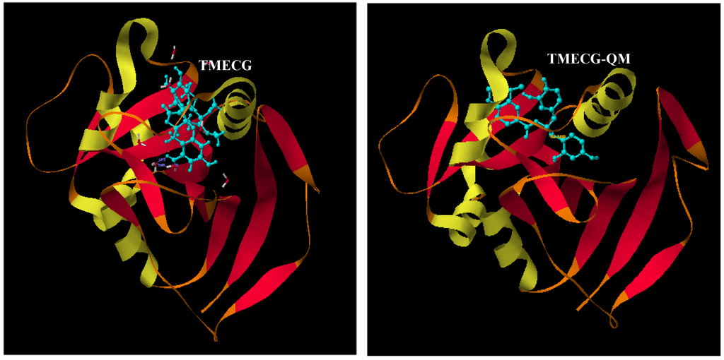 Compared with other inhibitors of the enzyme, TMECG-QM showed intermediate affinity between MTX and catechins; thus, TMECG-QM bound more than two-order of magnitude more strongly than EGCG, ECG or TMECG but forty-times less than MTX (Table 1). Molecular modelling helped us to understand the high affinity of human DHFR for TMECG-QM. The open structure of the TMECG-QM increases its molecular flexibility and adopts a different conformation in the active site of human DHFR (Figure 6).