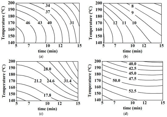 Table 2 reveals that the aroma, taste, crispness, and overall preference scores of the fried falafel were linearly associated with the frying temperature and time, quadratically related to the frying temperature, and connected to the interaction effects of the frying temperatures and time. Hence, the predictive models presented in Table 2 could be satisfactorily employed in predicting the properties of the fried falafel judging from R2 > 0.80 with no lack of fit [28,37,43]. Furthermore, the properties of the falafel as affected by the frying temperature and time could be predicted using the data charted in Figure 3.