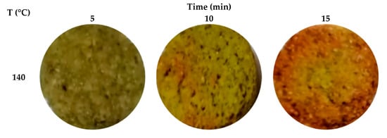 On the other hand, the color attributes of fried products significantly influence consumer satisfactoriness. The lightness/darkness value (L*), redness (a*), and yellowness (b*) of the fried falafel were determined but due to L*-value is considered a vital factor in the frying industry and is commonly used as a quality control parameter, therefore it can be only focused on L*-value [39]. Usually, a dark-colored product is not preferred by consumers, thus, a suitable optimum condition is very important during the frying process to avoid food burning. Clearly, a decrease in L* values was observed with the increase in the frying temperature and time (Figure 1). Contrarily, an increase in ΔE was detected as the temperature and time increased. The observed outcome in this investigation was consistent with the previous finding realized by Abd Rahman et al. [2] for fried sweet potato. Such a finding is possibly linked to the non-enzymatic browning and pyrolysis reactions that occur during the frying process which enhance the development of brown pigments, and consequently, give the fried falafel a darker color. Heat and mass transfer during the frying process could also be a reasonable reason for physicochemical alterations that affected the color of fried foods. Figure 2 portrays the effect of different frying temperatures and times on the color of the air-fried falafel.