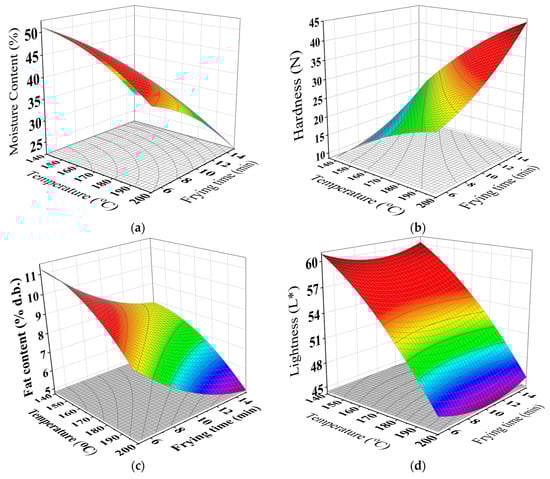 To examine the suitability of the polynomial model for fitting the properties of the fried falafel, regression analysis was performed. Obviously, it can be seen from Table 2 that the properties (moisture content, hardness, and appearance) of fried falafel were linked to the linear, quadratic, and interaction effects of the frying temperatures and time, while there are linear and quadratic effects of frying temperatures and time of the fat content and the L*-value of the fried falafel.