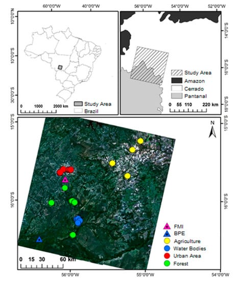 The study area is in the transition region Cerrado-Pantanal, covering path 226 and row 71 of the satellite Landsat 8 in southern Mato Grosso, Brazil (Figure 1). Data from two flux towers were used, one in the Cerrado and the other in the Pantanal. The Cerrado tower is located in Fazenda Miranda (FMI) (15°43′55″ S; 56°4′19″ W), approximately 15 km south of the city of Cuiabá. The vegetation at the FMI is dominated by native and exotic grasses and by the semi-deciduous trees Curatella americana L. and Diospyros hispida A.DC [], and the soil is classified as Plinthosols []. The Pantanal flux tower is in the Baia das Pedras (BPE) of the Estância Ecológica SESC-Pantanal (16°29′52″ S; 56°24′44″ W), in the municipality of Poconé, approximately 160 km from Cuiabá. The predominant vegetation in BPE is composed of the tree Combretum lanceolatum Pohl [], and the soil is classified as Gleysols []. The BPE topography is flat, with flooding occurring from January to June. The Köppen–Geiger climate classification of the entire study region is Aw []. Annual rainfall is 1372 mm, with a dry season from May to September and a wet season from October to April, and average annual temperature of 26.9 °C [].