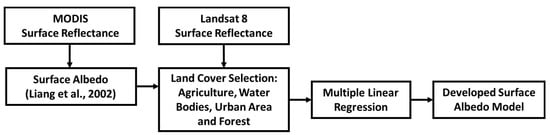 - Developing a surface albedo model by combining MODIS and Landsat 8 dataset. A subset of the data was used for model development and the remaining was used to evaluate the model performance over different land cover types. In this analysis, the MODIS surface albedo by Liang et al. [] was assumed to be as a reference against which to compare the developed and existing models.