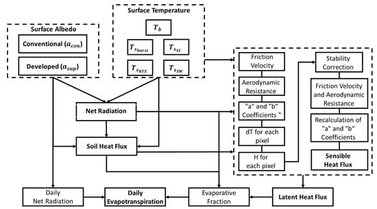 The SEBAL algorithm was processed according to the flow chart shown in Figure 3. It was proposed to estimate the daily evapotranspiration (ET) from the instantaneous latent heat flux (; W m−2) obtained as a residue of the energy balance equation (Equation (18)):