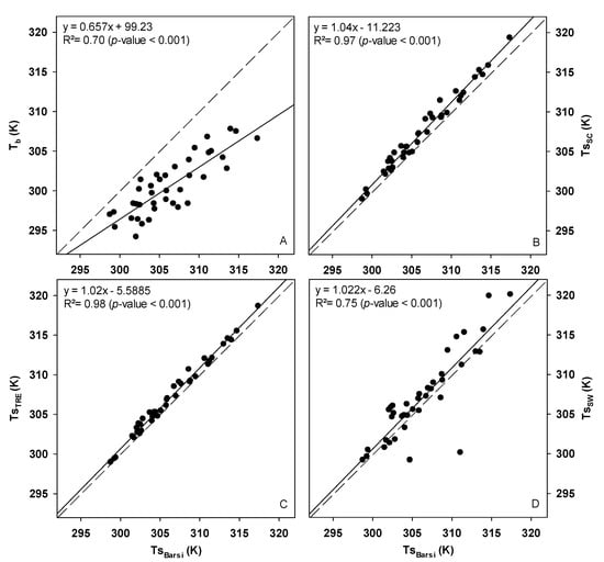 Relation of (A) the surface temperature corrected by the Barsi model (; K) and brightness temperature (); (B) the surface temperature corrected by the single-channel model (; K); (C) the surface temperature corrected by the radiative transfer equation model (; K); and (D) the surface temperature corrected by the split-window model (; K).