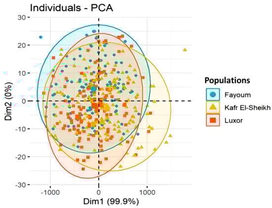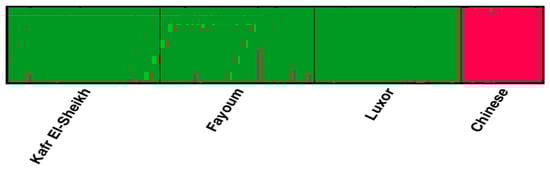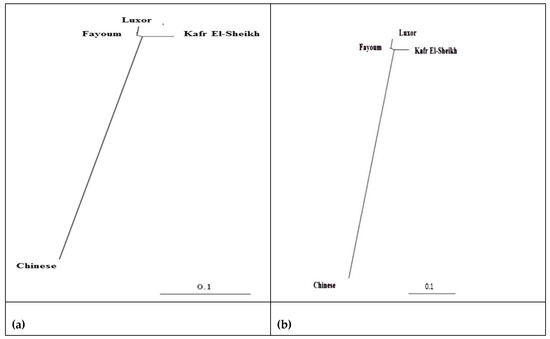 Lower genetic diversity reduces individuals’ fitness and limits their ability to adapt to environmental change, consequently increasing their risk of extinction []. Moreover, FIS is used to obtain a deeper insight into the degree of inbreeding and endangerment potentiality and is considered an important tool to judge conservation priority []. Therefore, when FIS is more than 0.05 or less than 0.40, the ranges being from 0.05 to 0.15, 0.15 to 0.25 or 0.25 to 0.40, this means that the population is not in danger, is potentially endangered, minimally endangered or endangered, or is critically endangered, respectively. In this study, the Kafr El-Sheikh, Fayoum and Luxor populations showed high levels of inbreeding (0.233, 0.277 and 0.114, respectively), suggesting their potential endangerment [].