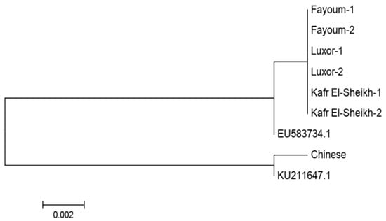 PCR was performed to amplify a 710-base-pair segment of the goose mitochondrial control region (D-loop) by using the primer pair F: 5′-CCTCTGGTTCCTCGGTCA-3′ and R: 5′-CAACTTCAGTGCCATGCTTT-3′ []. Two samples from Egyptian domestic geese from each governorate were amplified and sequenced. Moreover, one sample from a Chinese goose (Anser cygnoides) was sequenced for comparison. PCR was performed in a total volume of 15 µL, containing 20 ng of mtDNA, 2× PCR buffer, 400 μM of each dNTP, 0.3 μM of each primer and LA-Taq polymerase at 0.5 U (Takara, Shiga, Japan). PCR amplification was performed for 35 cycles after initial incubation at 95 °C for 5 min. Each PCR cycle consisted of 95 °C for 45 s, an annealing temperature of 56 °C for 45 s, 72 °C for 60 s, followed by a final extension of 72 °C for 10 min. A PCR purification kit (Roche, Mannheim, Germany) was used for purification of the amplified products; then, the purified products were sequenced using the same primers with the Big Dye Terminator ver. 3.1 Cycle sequencing kit (Applied Biosystems, Foster City, CA, USA) and electrophoresed on an ABI PRISM 3130xl DNA sequencer (Applied Biosystems, Foster City, CA, USA). BLAST software [] was used for sequence identification and confirmation. MEGA 7 [] was used for sequences alignment and to infer the phylogenetic relationships based on neighbor-joining methods [].