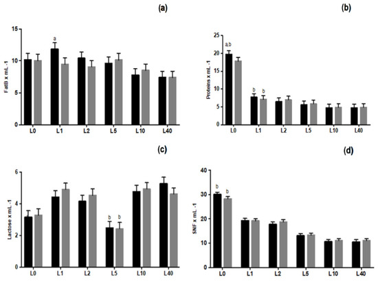 Chemical analysis revealed that MEL-treated ewes had a higher amount of proteins (Figure 6) at lambing and higher fat content 24 h later (p < 0.05) compared to CON ewes. Moreover, both groups showed increased levels of SNF and TS© at lambing and decreased levels of lactose on day L5 (p < 0.05).