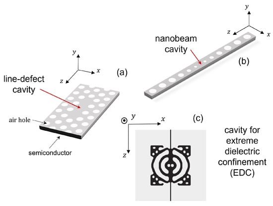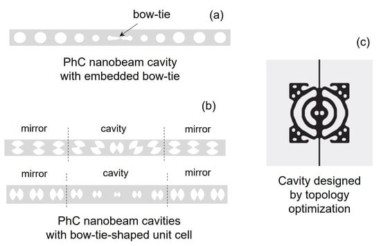 In this work, we focus on photonic crystals consisting of air holes in a semiconductor material, rather than, e.g., isolated dielectric rods in air []. Figure 1 shows three examples of PhC cavities. A line-defect cavity (Figure 1a) is formed by introducing a defect within an otherwise (ideally) perfect PhC structure. This structure is carved out of a semiconductor slab (for instance, GaAs, InP or Si), by perforating the slab with a periodic patterning (i.e., a lattice) of air holes. The region surrounding the defect collectively acts as a distributed Bragg reflector, thereby efficiently trapping light inside the cavity. Light confinement in the vertical (i.e., y) direction is by total internal reflection. The hexagonal lattice ensures a large photonic band gap for TE polarization (i.e., with the electric field predominantly in x direction) [] and is often employed in the realization of PhC lasers. In this case, the slab also includes the active medium, made of strained quantum wells [,] or quantum dots [,], which provide high gain for TE-polarized light. A cavity may also be realized in a semiconductor nanobeam [] (Figure 1b). In this case, the photonic band gap confines the light in the longitudinal (i.e., z) direction, and confinement in the other directions is by total internal reflection. By exploiting a bow-tie structure, a cavity exhibiting spatial confinement of light deep below the wavelength of light in the material may be realized [,]. Figure 1c shows an example of such a cavity realized by topology optimization, which also displays such extreme dielectric confinement (EDC) [].