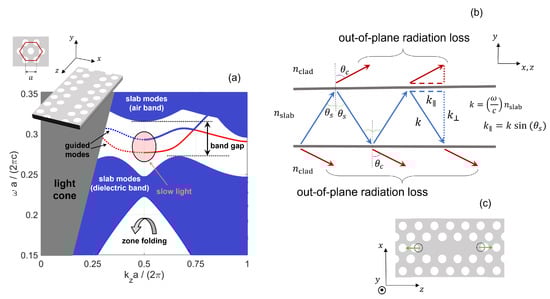 (a) A dispersion diagram of TE-like modes of a line-defect waveguide in a photonic crystal membrane, as depicted in the inset. The y-axis shows the angular frequency, , normalized to , with c being the light speed in vacuum and a the lattice constant. The x-axis shows the wavevector along the propagation direction, , normalized to . Modes in the gray area (the so-called light cone) are not confined by total internal reflection in the membrane. Details on the simulation parameters are provided in Section 4.1. (b) A ray-optics illustration within the light cone of the reflection and transmission at the interface between semiconductor slab and air cladding. (c) Optimization of a line-defect cavity by displacement of the holes at the edges of the cavity. The hole shift reduces the out-of-place radiation loss.