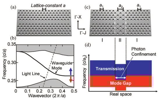 In terms of Q-factor, better performances can be achieved by photonic heterostructure cavities. A so-called photonic heterostructure is a connection in series of two or more PhC waveguides with different photonic band gaps. The photonic band gap can be engineered by structural changes, such as tuning the lattice constant [,], waveguide width [] or slab refractive index []. The working principle is summarized by Figure 3. In this case, the cavity is formed by connecting line-defect waveguides with different lattice constants. Essentially, the larger lattice constant in region II as compared to regions denoted by I (see Figure 3c) induces a relative shift of the band edges corresponding to the various regions (see Figure 3b,d). This ensures an effective confinement of photons along the waveguide direction. In fact, photons which are allowed to propagate in region II find themselves within the band gap of regions I.