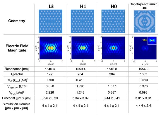 Figure 4 compares three PhC cavities (respectively, L3, H1 and H0) against an EDC cavity designed by topology optimization. This structure is very similar to that reported in [], the difference only being the dielectric bridge in the center, as detailed in the figure caption. We have extracted Q-factor and mode volumes by three-dimensional finite-difference-time-domain (FDTD) calculations, with all cavities made of InP. For a fair comparison, the PhC cavities have been tailored to a similar footprint as the EDC cavity, which resulted in the Q-factor of the PhC cavities being strongly limited by in-plane radiation loss. This comparison displays, though, an original perspective, and points out that EDC cavities may potentially offer a better Q-factor than other PhC cavities of the same size. As for the mode volumes (see Equations (1) and (3)), the simulation domain coincides with the integration volume, V; and the volume of the nonlinear material, , is that of InP alone. All mode volumes are smaller for the EDC cavity, which thereby promises enhanced light–matter interactions for various applications. We notice that EDC cavities impose stringent demands to nanofabrication, but very good progress has recently been reported [].