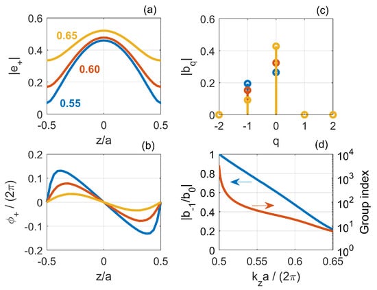 Figure 7 shows (a) the magnitude and (b) phase of the forward-propagating Bloch mode in a unit cell as a function of z. Here, is the center of the supercell along the longitudinal direction, as indicated in Figure 6b. Each color corresponds to a different value of the wavenumber, reported in units of . These figures highlight that, as the wavenumber approaches the band edge at , (1) the peak-to-peak amplitude increases and (2) the phase linearly varies with z over a larger and larger portion of the unit cell. These features are common to Bloch modes of conventional Bragg gratings []. Moreover, whichever the frequency, the phase is zero at the input and output of the unit cell. Being periodic, the Bloch modes can be expanded in a Fourier series, namely . The spatial harmonics, , are reported in Figure 7c. The harmonics with q other than and 0 are negligible. Therefore, we may express as
