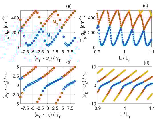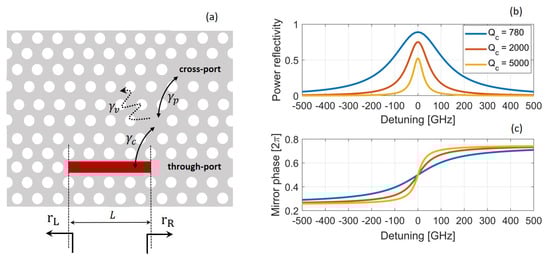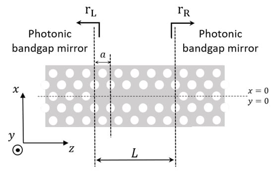 in agreement with [,]. Here, m is an integer. Equation (13) provides the detuning of the wavenumber from the band edge for the longitudinal resonant mode of order m. As the cavity length increases, this detuning diminishes. Correspondingly, the frequency of the resonant mode decreases, by following the dispersion relation of the underlying line-defect waveguide (see Figure 2a, red line). Importantly, FDTD simulations of LN cavities have revealed that the resonant modes do obey Equation (13) to good approximation []. Therefore, we take this agreement as an indication that the phase of the left and right mirror reflection coefficient in Figure 8 may be approximated with either zero or . In Section 4.4, we show that zero is the right approximation.