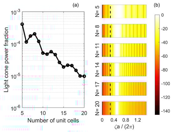 We define the light cone power fraction as the relative fraction of the electric field intensity within the light cone, namely , where is the upper limit of the light cone for a given cavity length. By computing the light cone power fraction as a function of the cavity length, one obtains an approximate measure of the scaling of the radiation loss with the size of the cavity []. The absolute radiation loss rate and, therefore, the Q-factor, may be quantified through full 3D-simulations of the structure (see, e.g., [] for a comparison of different numerical methods and their accuracies), but this falls outside the scope of this paper.