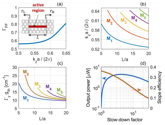 With these choices, the eigenmodes of the artificial three-dimensional lattice well approximate those of the line-defect waveguide. We assume the simulation parameters in Table 1, reflecting the PhC lasers of []. Figure 2a shows the band structure for TE-like modes, computed by the plane wave-expansion method []. In the following, we focus on the lower-frequency guided mode, denoted by red in Figure 2a.