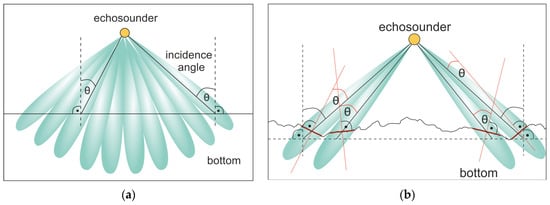 The main task of industrial MBES measurements is bathymetry, but systems have improved with regard to backscattering strength measurements of both the water column and the seafloor []. Especially in shallow water less than 20 m in water depth, ship-based MBES offers great potential for recording sidescan-like snippets []. The intensity of backscattered signals depends on many parameters, such as the geoacoustic properties of the seabed, but it is also controlled by the sonar-target geometry, including the individual beam incidence angles and varying bottom reverberation areas (Figure 1) modulated by the local slope of the seabed.