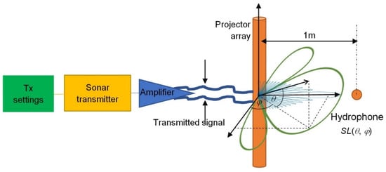 Figure 2 shows the transmitter path calibration setup. According to given Tx settings, the sounding pulse waveform is generated in the sonar transmitter segment and projected into the water column in the laboratory tank toward the hydrophones. The hydrophone pointed at (θ, φ) with respect to the center of the projector array registers the source level for this direction.