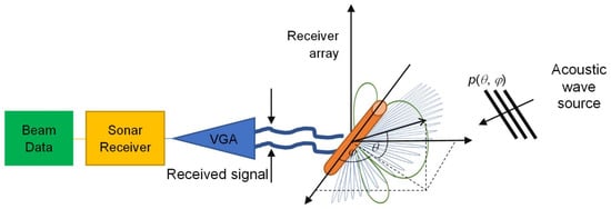 Figure 3 shows the receiver path calibration setup. The independent sound source pointed at (θ, φ) and situated at a given distance generates an acoustic wave of known characteristics p(θ, φ). After being received by the echosounder receiver array and transformed into the electric domain, then into digital form, the appropriate signal processing is done in the sonar receiver segment, including VGA, beamforming, and matched filter processing, resulting in beam data.