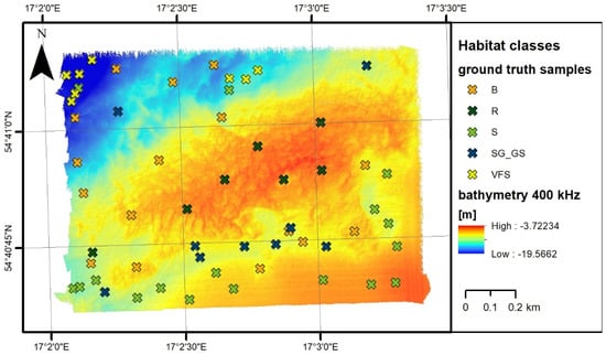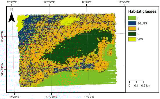 In the studied area, 57 samples of bottom sediments were collected [], and benthic habitats were separated into five classes [,]: S, sand; SG-GS, sandy gravel or gravelly sand; B, boulders; R, red algae on boulders; VFS, very fine sand (Figure 5). The area was divided into six classes using object-based image analysis (OBIA) classification [], presented in Figure 6. We also considered samples on artificial structures (wrecks), but since they were not representative in the later part of data analysis and statistics calculation, this class was omitted. Grab samples were collected from aboard the University of Gdansk research vessels Oceanograf and Zelint.